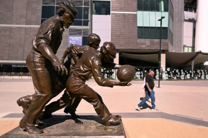 A man looks at a sculpture of Australian Rules footballers outside the Melbourne Cricket Ground © AFP William WEST